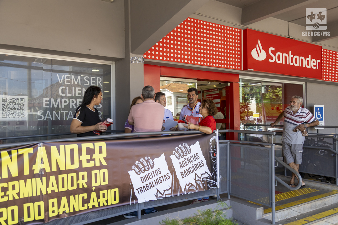 Nesta terça-feira, 04 de novembro, foi realizado o Dia Nacional de Mobilização em Defesa dos Trabalhadores e dos Clientes do banco Santander. Em Campo Grande, os diretores do Sindicato dos Bancários de Campo Grande-MS e Região se mobilizaram em frente à agência da Barão do Rio Branco para denunciar um modelo de gestão baseado na precarização e na terceirização.