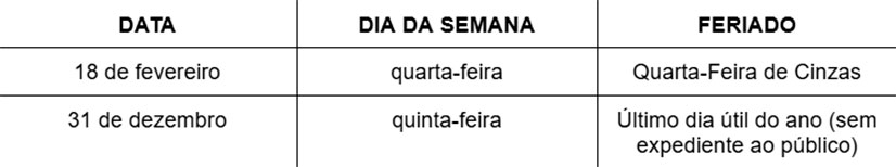O ano também terá dois dias diferenciados. Na Quarta-Feira de Cinzas (18/02), o início do expediente será às 12h, no horário local, com encerramento previsto no horário normal de fechamento das agências. Nas localidades em que as agências fecham normalmente antes das 15h, o início do expediente bancário será antecipado, de modo a garantir o mínimo de 3 horas de atendimento presencial ao público.
