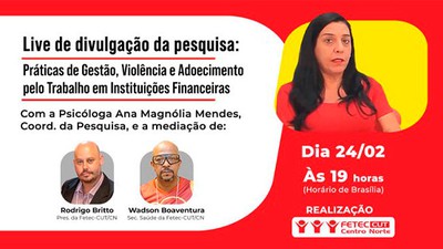 A Federação dos Trabalhadores em Empresas de Crédito do Centro-Norte (Fetec-CUT/CN) realiza nesta terça-feira, 24 de fevereiro, às 19h (de Brasília), uma live com a psicóloga do trabalho Ana Magnólia Mendes, na qual ela vai explicar os resultados da pesquisa sobre “Práticas de Gestão, Violência e Adoecimento pelo Trabalho em Instituições Financeiras”, que ela coordenou no segundo semestre de 2025 para a Fetec. Os mediadores serão Rodrigo Britto e Wadson Boaventura, respectivamente presidente e secretário de Saúde e Condições de Trabalho da Federação Centro-Norte.