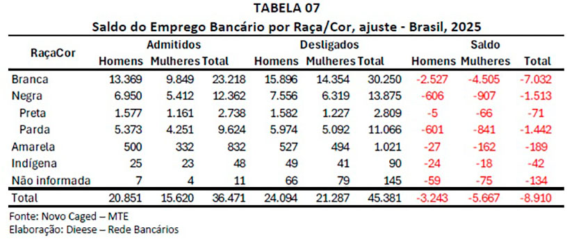 Ao longo de 2025, entre admissões e demissões, o saldo no setor bancário ficou negativo em 8.910 postos. Somente os chamados "Bancos Múltiplos, com carteira comercial", ou seja, empresas como os bancos tradicionais (a exemplo de Santander, Itaú, Bradesco e Banco do Brasil), foram responsáveis por 9.138 postos fechados no setor e enquanto a Caixa Econômica foi responsável pela abertura de 1.185 postos de trabalho.