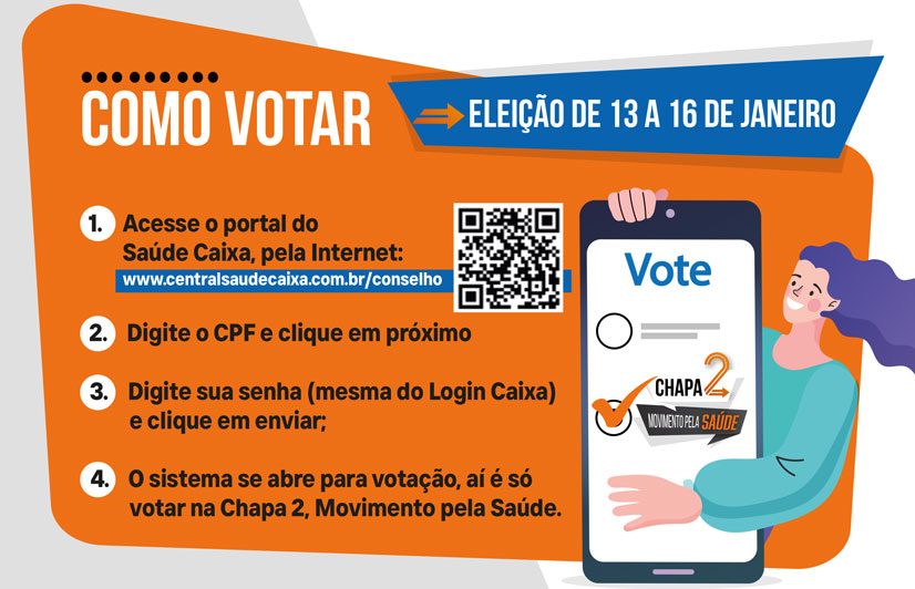 A votação ocorre de 13 a 16 de janeiro, pelo portal do Saúde Caixa. Para participar, basta acessar o site, realizar o login com CPF e senha do Login Caixa, receber o código de validação e registrar o voto na Chapa 2 – Movimento pela Saúde.