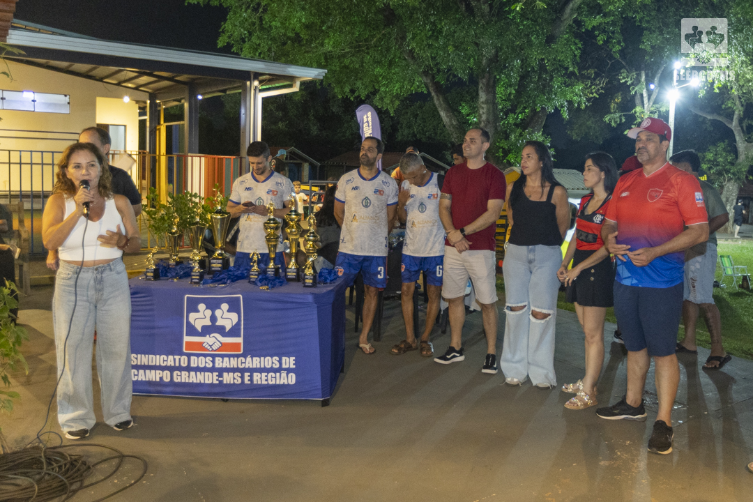 A presidenta do SEEBCG-MS, Neide Rodrigues, parabenizou os participantes e destacou o espírito de união do evento. “Parabéns a todos os atletas que participaram, especialmente àqueles que venceram e demonstraram categoria, capacidade e organização nesta final. O mais importante é que todos vocês vieram para jogar e confraternizar. Desejamos que continuemos assim, e que no ano que vem todos voltem a competir”, destacou. A presidenta ainda ressaltou o investimento realizado para a final: a nova iluminação dos campos de futebol, que recebeu uma padronização para reforçar a visibilidade durante os jogos noturnos.