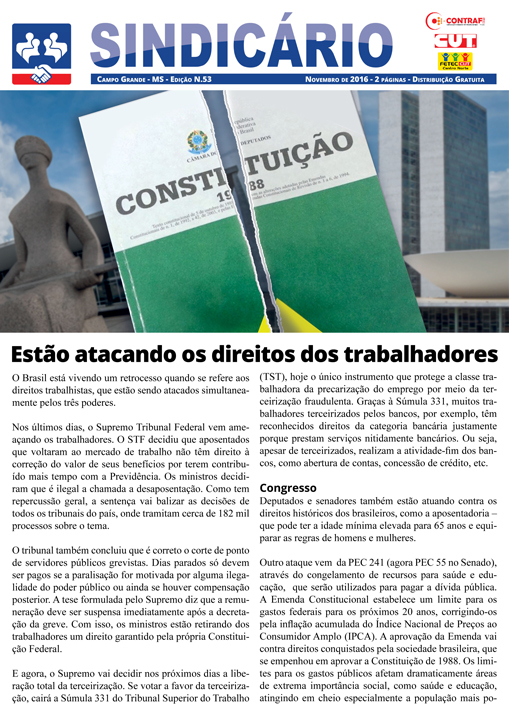 A edição de número 53 do jornal Sindicário, publicação do sindicato, traz informações sobre a retirada de direitos trabalhistas através de projetos de lei que tramitam no Congresso e também de decisões do Supremo. Entre eles, está a mudança na aposentadoria, a suspensão imediata da remuneração dos servidores após decretação de greve e também os recursos que serão congelados com a PEC 241 (agora PEC 55 no Senado).