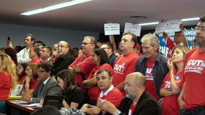 (Brasília) - Vestidos de vermelho, segurando diversas faixas e gritando palavras de ordem, centenas de trabalhadores e trabalhadoras, incluindo os bancários, lotaram o plenário 1 do Anexo II da Câmara dos Deputados, em Brasília, no início da tarde desta terça-feira (11), para protestarem contra o projeto de lei (PL) 4.330, de autoria do deputado Sandro Mabel (PMDB-GO), que amplia a terceirização e torna a precarização das relações trabalhistas um grande negócio.