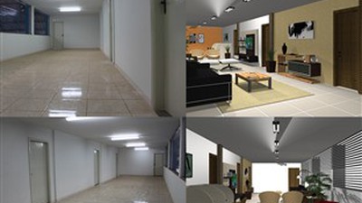 Imagens: Lado esquerdo - Foto atual do Hotel. Lado direito - projeto em 3D do espaço mobiliado.