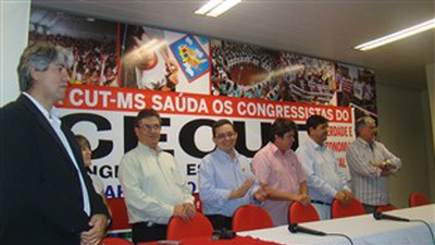 Delegados do Sindicato dos Bancários de Campo Grande e região participaram nesta quinta-feira, da abertura do IX Congresso Estadual da CUT, ocorrida na sede da Fetems (Federação dos Trabalhadores em Educação de Mato Grosso do Sul). O evento reuniu mais de 200 delegados, convidados e de dirigentes nacionais da CUT e tem continuidade até nesse próximo domingo. O SEEBCG-MS voltou a participar da central após quatro anos de ausência. A mesa de trabalhou contou a participação de dois ilustres representantes da categoria: o ex-Governador José Orcírio dos Santos (Zeca) e do superintendente de relações de trabalho, Anísio Tiago.