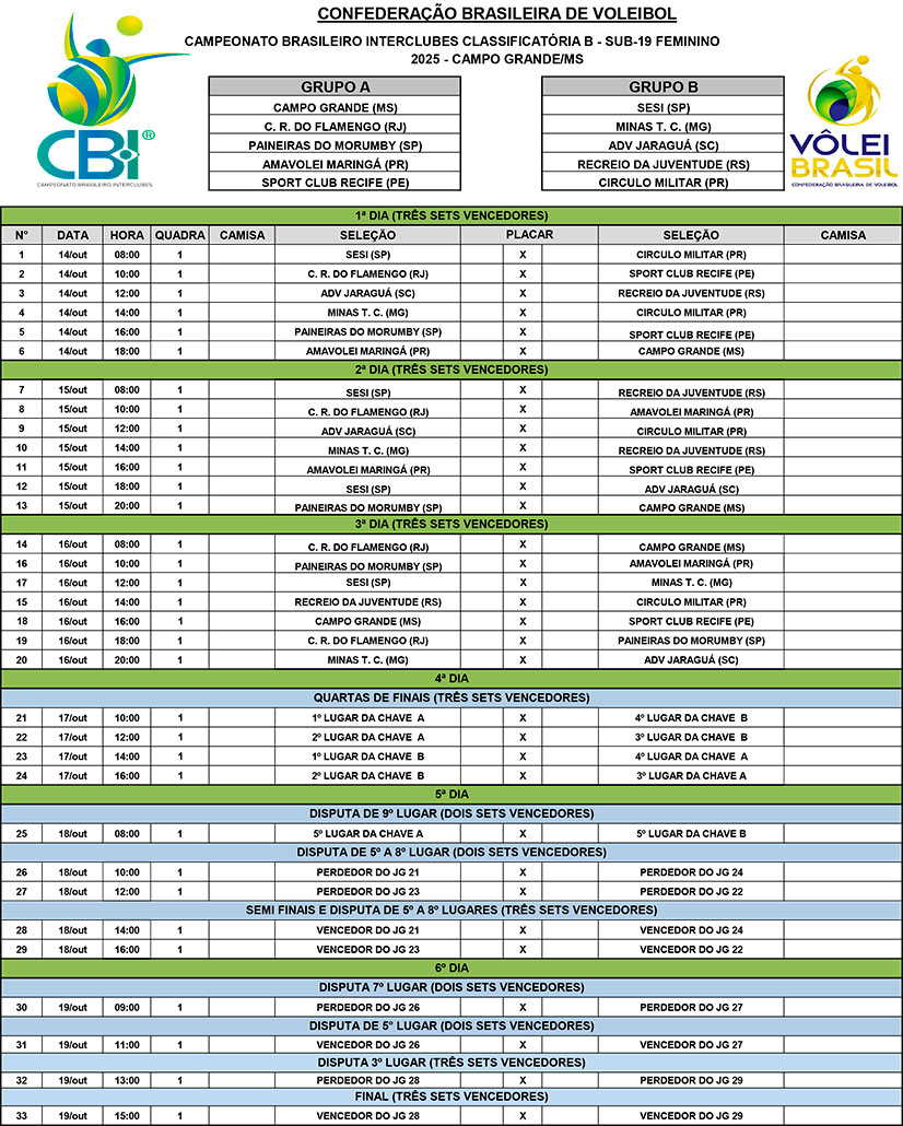 O campeonato segue até domingo (19) e reúne 10 equipes do país, como Flamengo-RJ, Minas Tênis Clube-MG, Sesi-SP, Paineiras-SP e outros. Quem representa o estado de Mato Grosso do Sul é o Campo Grande Vôlei.