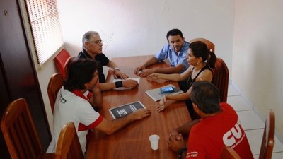 Na manhã de quinta-feira 21, se reuniram na sede do SINTSSMS, Iaci Azamor e Helio Sandim, dirigentes do Sindicato dos Bancários, com Alexandre Júnior Costa e Ronaldo Souza Costa da direção do sindicato e também Francisco Givanildo do Centro de Defesa dos Direitos Humanos Marçal de Souza Tupã i, para discutir a participação dos trabalhadores no debate da saúde pública, do controle social e da organização do setor na CUT-MS.