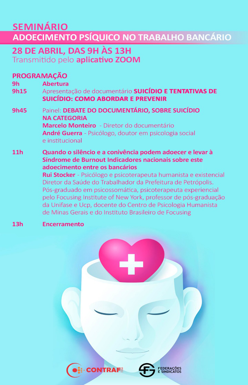 As inscrições para o Seminário Adoecimento Psíquico no Trabalho Bancário terminam nesta terça-feira (26). O evento, organizado pela Confederação Nacional dos Trabalhadores do Ramo Financeiro (Contraf-CUT), acontece na próxima quinta-feira (28), das 9h às 13h, e pode ser acompanhado pelo aplicativo Zoom. A data escolhida coincide com o Dia Internacional em Memória das Vítimas de Acidentes de Trabalho.