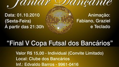 Pensando no lazer e na interação entre os bancários, o SEEB CG/MS e Região promove um Jantar Dançante, no Clube de Campo da instituição. Será no dia 1º de outubro, a partir das 21:30 horas. A data é estratégica já que o sindicato comemora também a final da V Copa de Futsal dos Bancários.