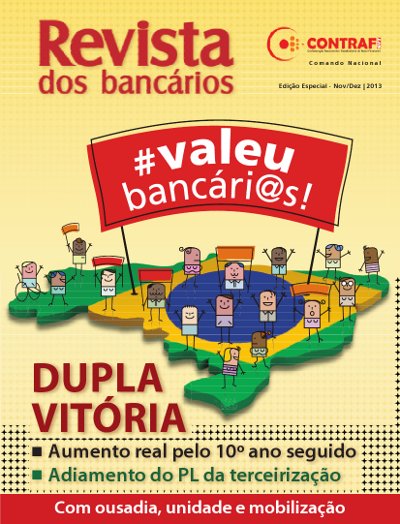 Sob o título "Dupla vitória", os sindicatos de bancários de todo o país estão distribuindo nos locais de trabalho a nova edição da Revista dos Bancários, publicação já tradicional de fim de ano da Contraf-CUT. A revista destaca a conquista de aumento real de salário pelo 10º ano consecutivo na Campanha Nacional 2013 e o adiamento da votação do Projeto de Lei (PL) 4330 da terceirização na Câmara dos Deputados após intensa pressão dos trabalhadores com forte participação dos bancários de todo país.