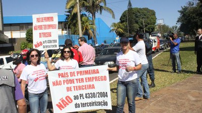 Cerca de 50 manifestantes acompanham a ação que entende que a terceirização vai diminuir o número de empregos em longo prazo, prejudicar as condições de trabalho do terceirizado, que, geralmente, ganha menos e tem uma jornada de trabalho maior.