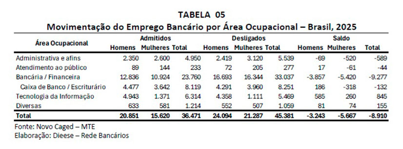 Ao longo de 2025, entre admissões e demissões, o saldo no setor bancário ficou negativo em 8.910 postos. Somente os chamados "Bancos Múltiplos, com carteira comercial", ou seja, empresas como os bancos tradicionais (a exemplo de Santander, Itaú, Bradesco e Banco do Brasil), foram responsáveis por 9.138 postos fechados no setor e enquanto a Caixa Econômica foi responsável pela abertura de 1.185 postos de trabalho.