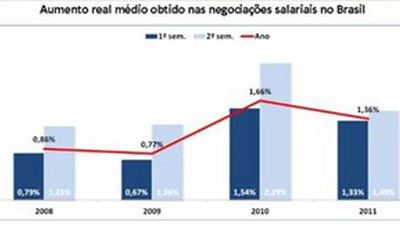 Levantamento preliminar do Dieese, com base nos acordos coletivos já fechados pelos sindicatos no Brasil, revela que o aumento real médio das categorias em 2011 tende a ficar em torno de 1,36%. Esse percentual é fruto do ganho médio de 1,33% no primeiro semestre e de 1,49% no segundo semestre.